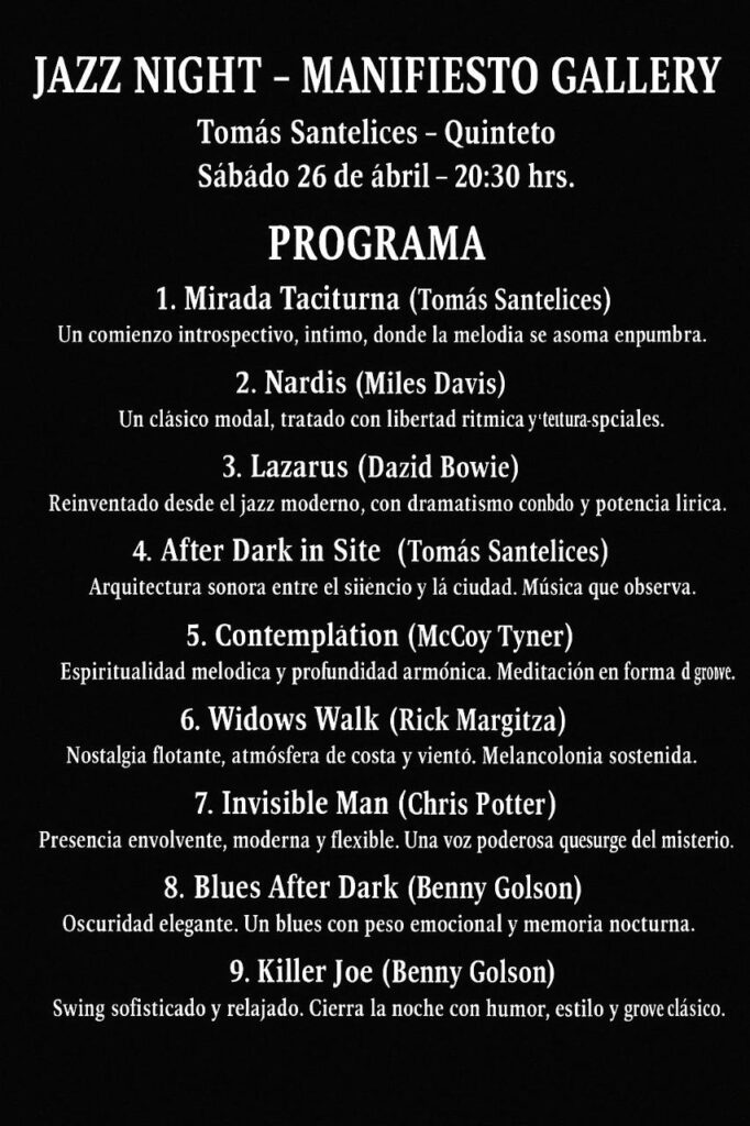 Maniffiesto Gallery a demostrado ser un espacio dinámico en donde su» público y audiencia es tratadas con gentileza y exclusividad» . Este 2025 sorprendió con la primera de muchas seductoras “Noches del Jazz” .